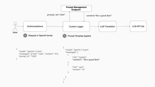 When you pass prompt_id="1234", the custom prompt manager will add a system message "Be a good Bot!" to your conversation: